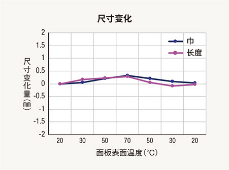 采用耐熱設(shè)計(jì),即使長(zhǎng)時(shí)間使用也不易翹曲和收縮,實(shí)現(xiàn)了大尺寸穩(wěn)定性。面板表面溫度改變50°C(20°C?70°C)時(shí),尺寸變化量最大小于0.5mm,非常穩(wěn)定。